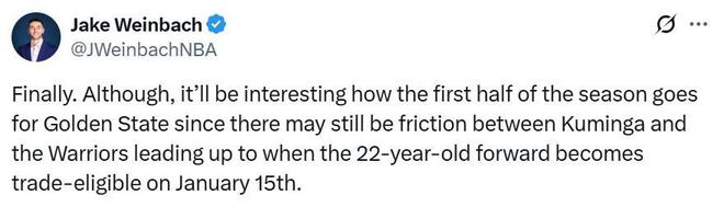美记Jake Weinbach坦言,勇士队前半个赛季显然会很热闹,在1月15日交易限制解除之前,库明加很有可能与球队闹矛盾。