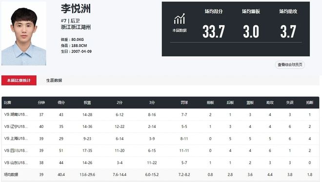 而李悦洲虽然没有能够帮助浙江队打入决赛,但他的表现也非常亮眼:在已经结束的五场小组赛和淘汰赛中,李悦洲能够在场均出战39分钟时间里得到40.4分3.6个篮板4.4次助攻1.8次抢断的数据,三项命中率分别是45.9%、39.5%和87.8%。通过比赛来看,李悦洲的个人进攻和硬解能力非常强,在U18联赛中可以说是独一档的存在,未来大有可期!