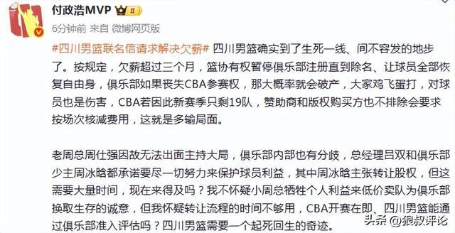 媒体人付政浩发文点评:四川男篮确实到了生死一线、间不容发的地步了。按规定,欠薪超过三个月,篮协有权暂停俱乐部注册直到除名、让球员全部恢复自由身,俱乐部如果丧失CBA参赛权,那大概率就会破产,大家鸡飞蛋打,对球员也是伤害,CBA若因此新赛季只剩19队,赞助商和版权购买方也不排除会要求按场次核减费用,这就是多输局面。