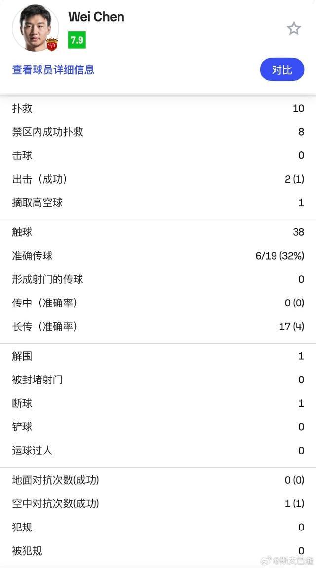 此役,海港队统计数据全面落后,能收获平局离不开门将陈威的出色发挥,扑救次数达到惊人10次。