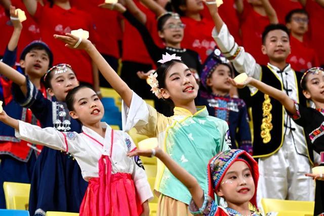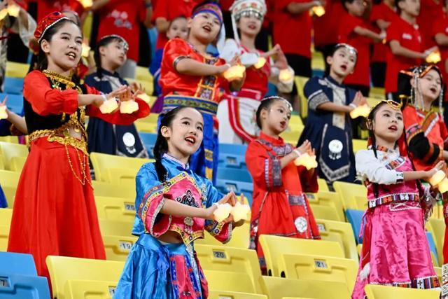 由于今晚是四川足球、成都足球历史上的首个亚冠主场比赛,所以公益看台上也特别展现了中国五十六个民族的传统盛装。600名来自成都各所中小学的同学们在看台上庄严献唱《有我》和《爱我中华》,也是在国庆前夕向祖国致以最深切的爱与祝福。