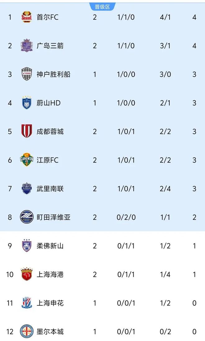 在目前的积分榜上,首尔FC和广岛三箭同积4分位列前两位,今晚赢球的成都蓉城排名第五,而上海海港则被挤出前八,以两战积一分的战绩排在第十,暂时无缘晋级区。