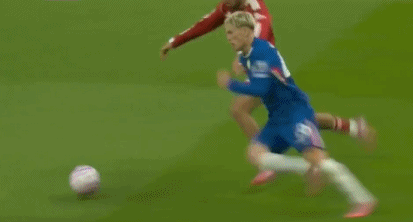 第39分钟,加纳乔左路强行加速突破,跟索博斯洛伊接触之后倒地,不过主裁判拒绝判罚点球。慢镜头看到索博斯洛伊有明显的推人动作,逃过了点球。